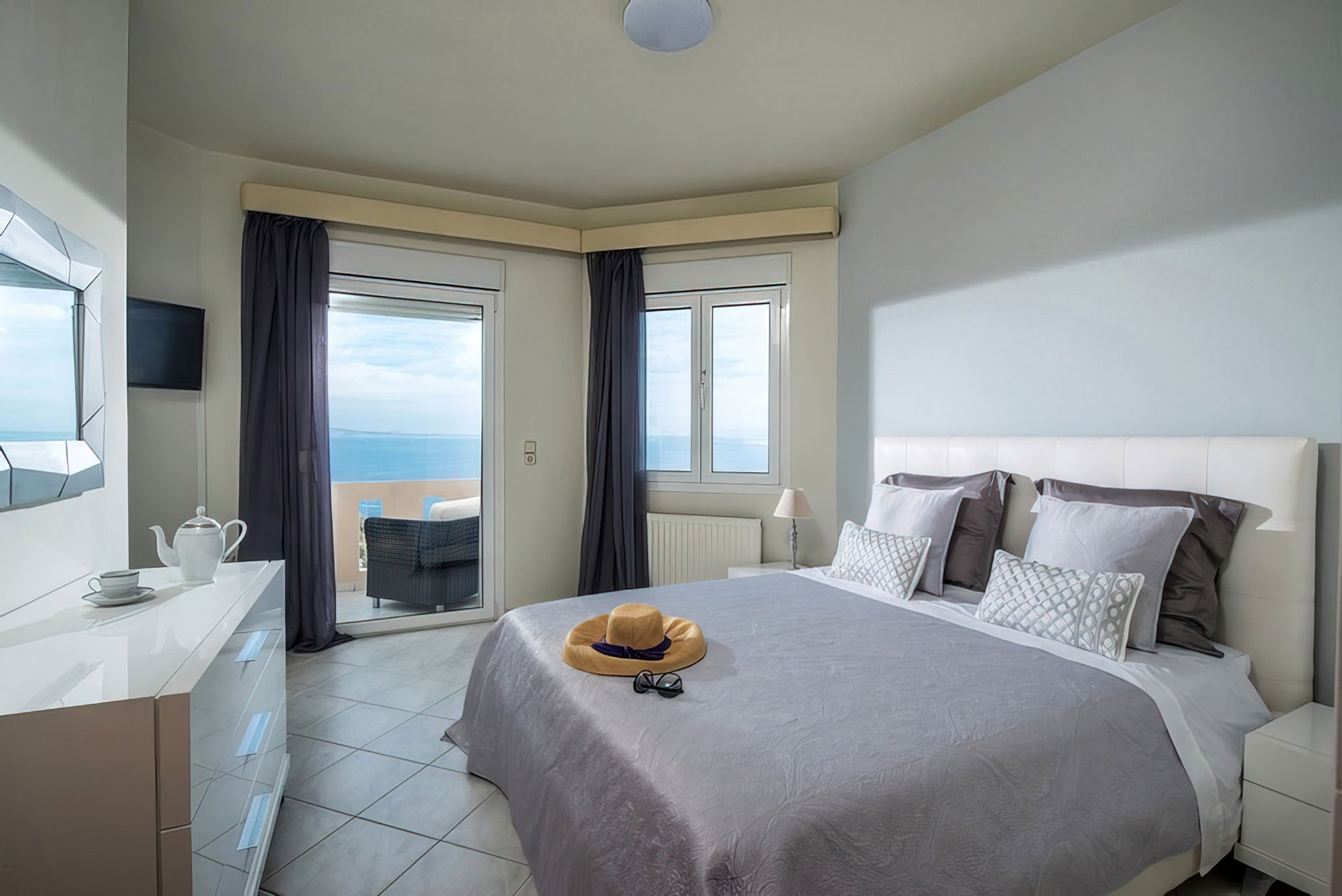 The first floor has a spacious and elegantly furnished hall and living room, filled with light and boasting more of the spectacular view. Art has been specially curated to complement the space, mirroring the natural beauty of Rodia. The second living room opens to a spacious balcony, where you can enjoy a meal or drink while overlooking the countryside. Space here is inviting, and the perfect place for creating memories that will last a lifetime. There is also a master bedroom with an en-suite bathroom on this floor, furnished for guests’ ultimate comfort.