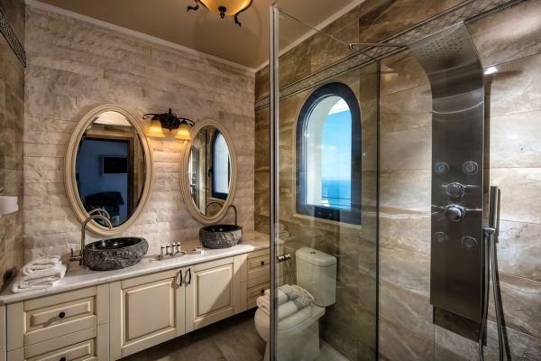 Villa Santorini sits atop a dramatic cliff that makes it seem like the dividing line between the sea and sky. Shining bright white for all to see, it stands against the bold blue seas in glorious contrast that immerses our guests in the true Greek Island experience. Villa Santorini was designed to reflect the architecture found in the Caldera, where classic white buildings and blue-domed roofs reflect the bright Greek sun. Here we pay homage to the great architecture that is renowned throughout the world. Our villa not only reflects the bright sun and the wine-dark Aegean but immerses our guests into the world of Antiquity. It is very easy to picture ships below, manned by Odysseus on his search for a home. When guests relax in our courtyard or gardens, the rustling of the distant olive groves and the hum of cicadas transports them to a far-off time of mystery and imagination. Though Villa Santorini is situated in the town of Lygaria, it is only 10 minutes away from the beautiful beach town of Agia Pelagia, where guests can find many incredible tavernas, shops, and nightspots. It is a beautiful cove with crystal blue waters, soft white sand, small cliffs to dive from, and a relaxed atmosphere that is unique to this small town. Villa Santorini is only 30 minutes from the Heraklion airport, and 15 minutes from Downtown Heraklion.