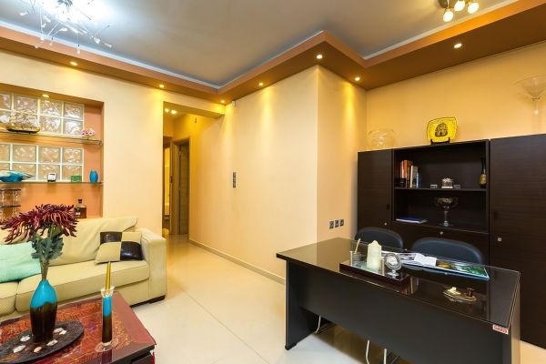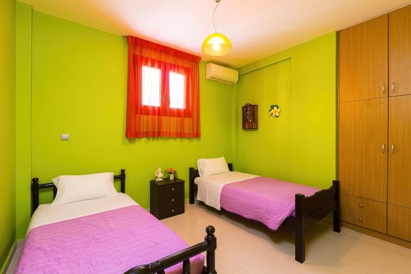 All bedrooms have a beautiful view of Mount Psiloritis and the Adelianos Kampos (sea). The same marble staircase, descending from the middle level, leads to the 3rd level of the villa, where the 4th bedroom of the villa is located, with 2 single beds, a bathroom (with a washing machine inside), and a/c. On the same level of the house, there is a small gym.