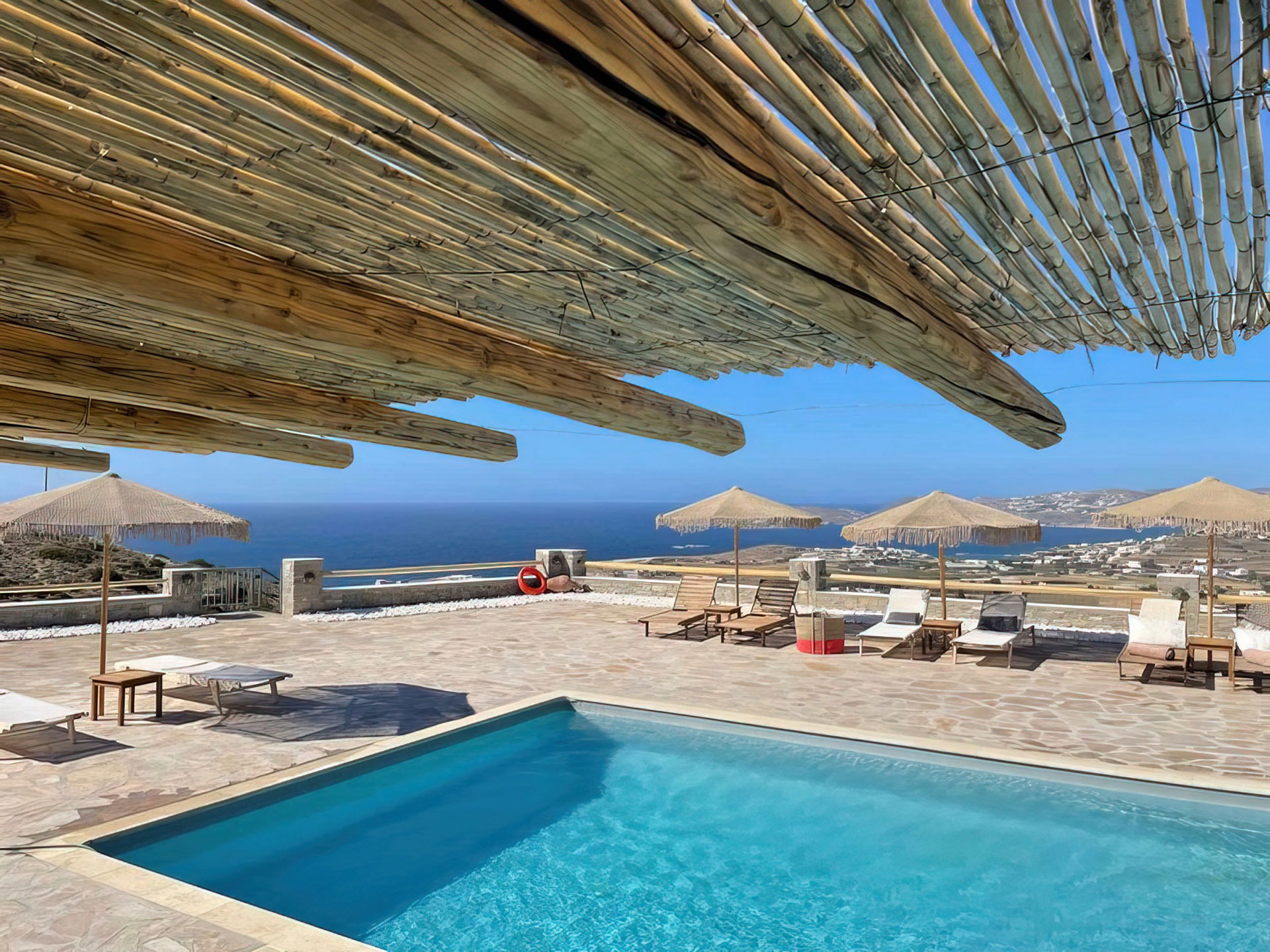 Villa Rodia Paros part of Mira Villas Complex is a stunning property on a 7,500 m² lot having outstanding, uninterrupted panoramic views of the Aegean Sea and the Bay of Paroikia.
