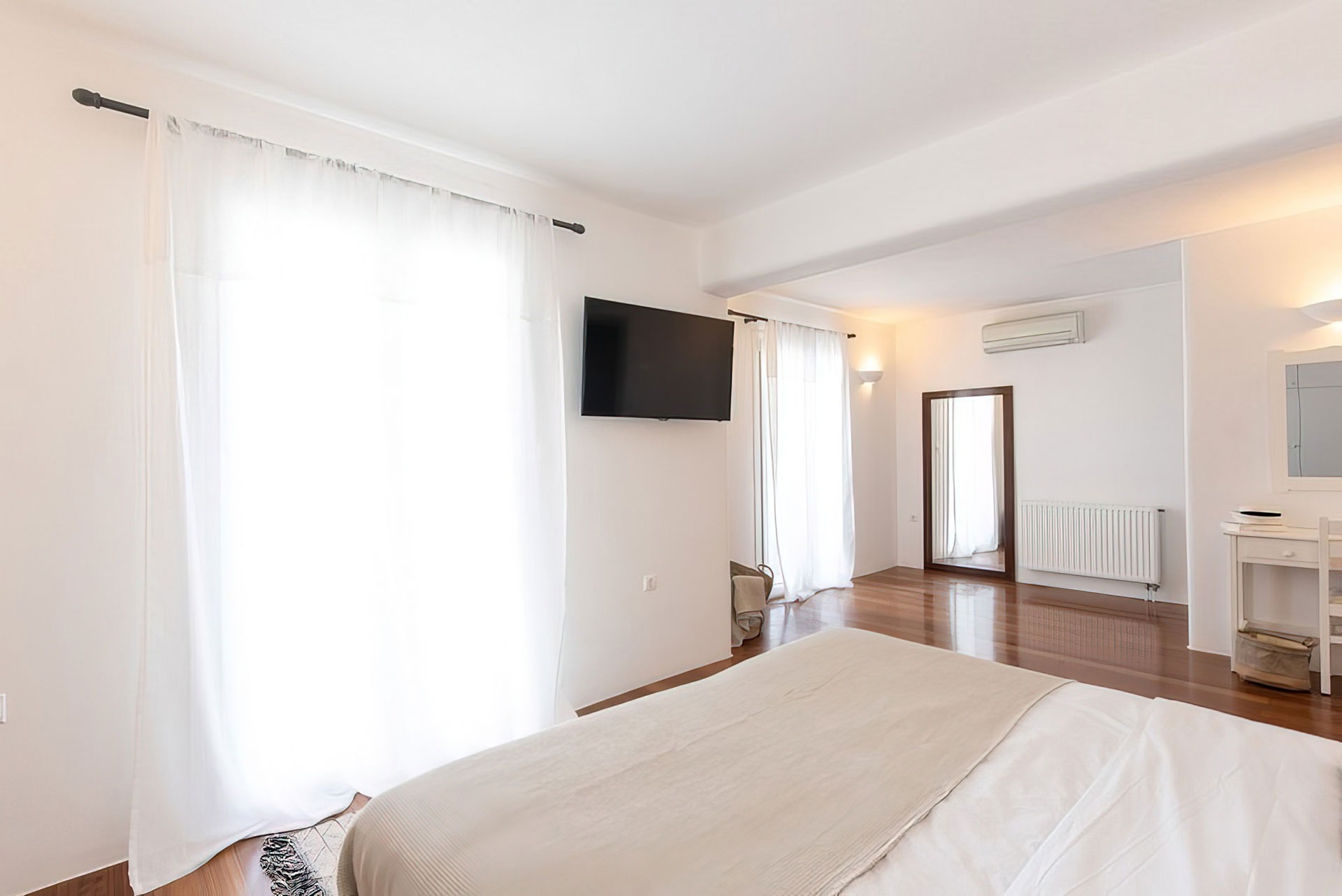 One master bedroom with minimal Cycladic design, windows and balcony that faces the Aegean Sea, large terrace.