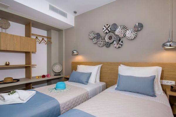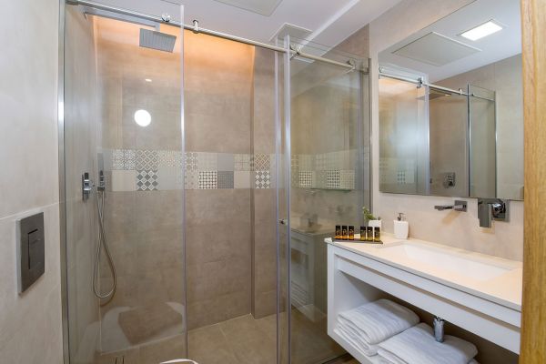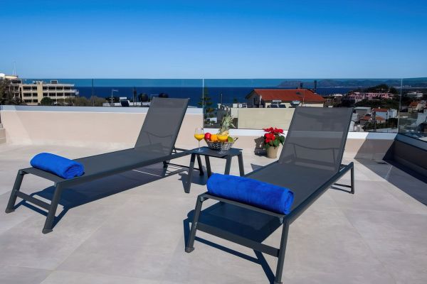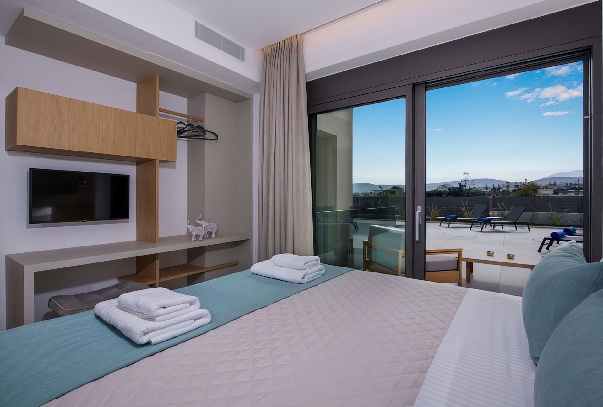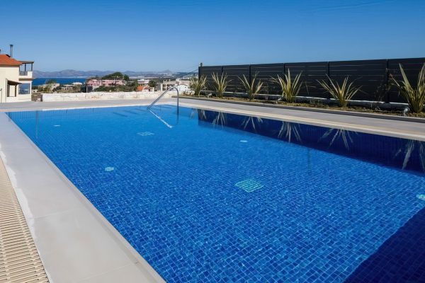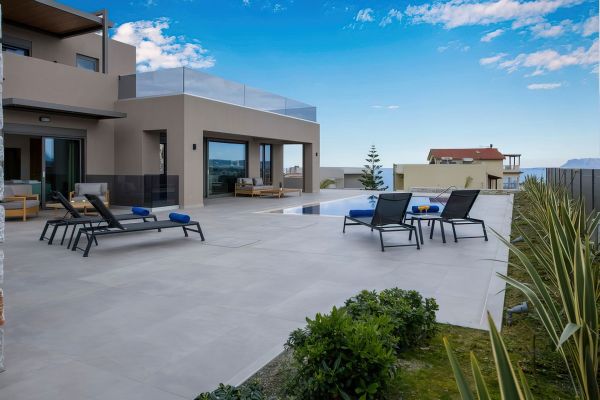 Going up the impressive wooden staircase you will find yourself on the first floor, which has a master bedroom with a king size double bed and en-suite bathroom, as well as a very large, furnished terrace with glass handrail from where one can enjoy the Cretan Sea, the Theodoros island and the White Mountains .Going down the stairs, you will find yourself on the lower level, which is another great addition to the house, having two additional rooms (2 single & double queen size) as well as two additional bathrooms with large glass shower cabins and granite benches. At this level you will also find extra facilities such as a fitness center, auxiliary seating area, a spa room and a laundry room.