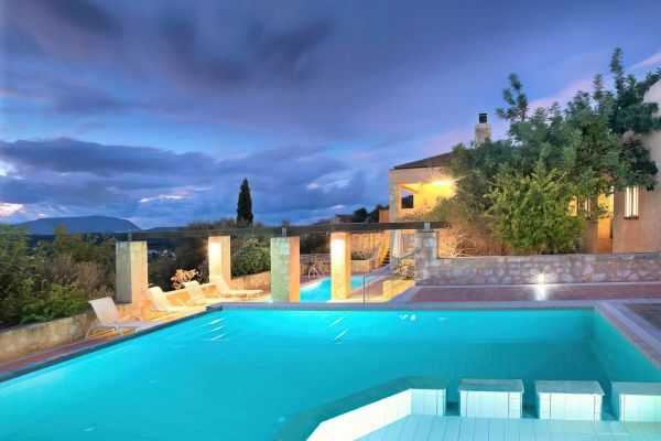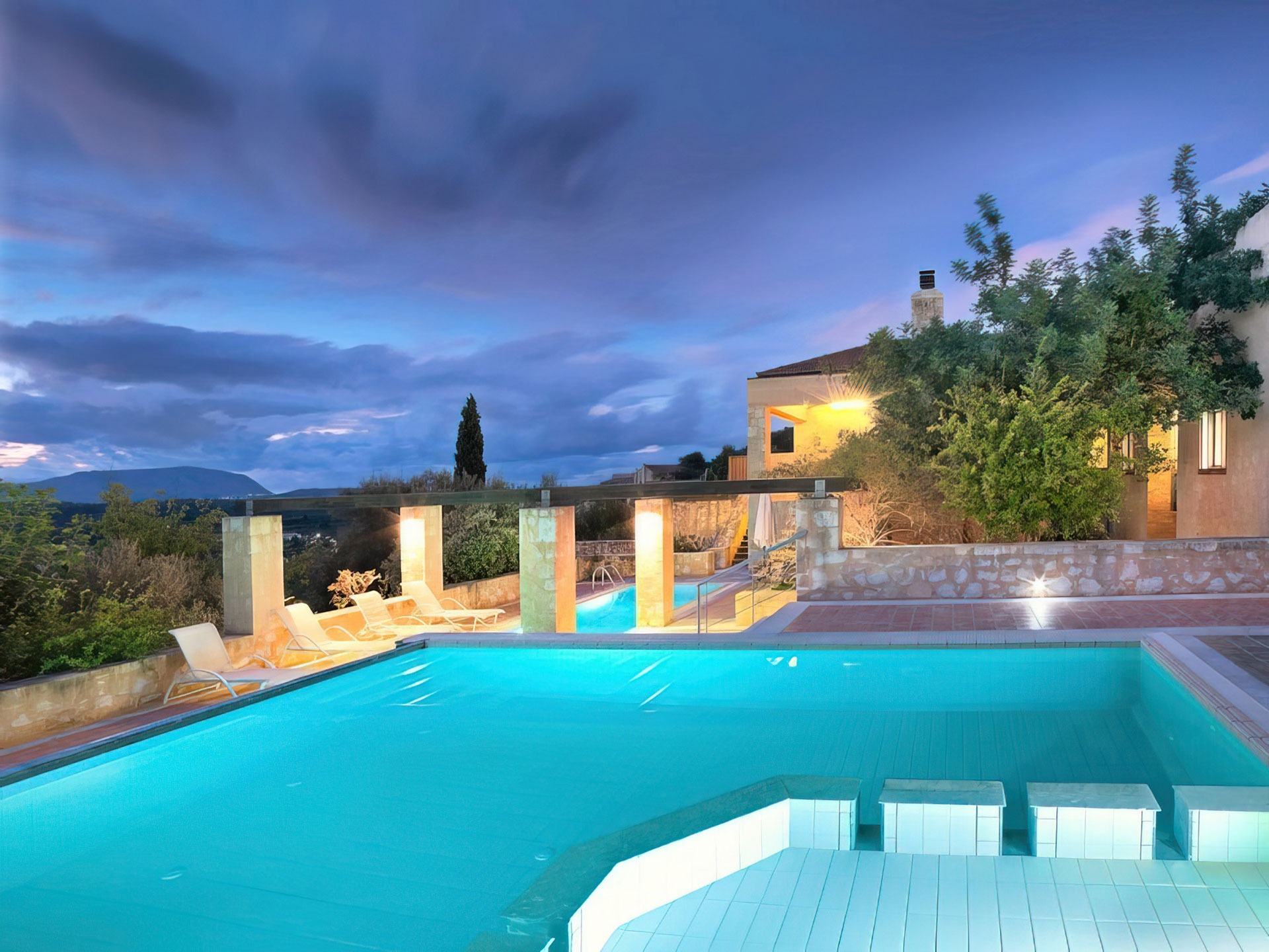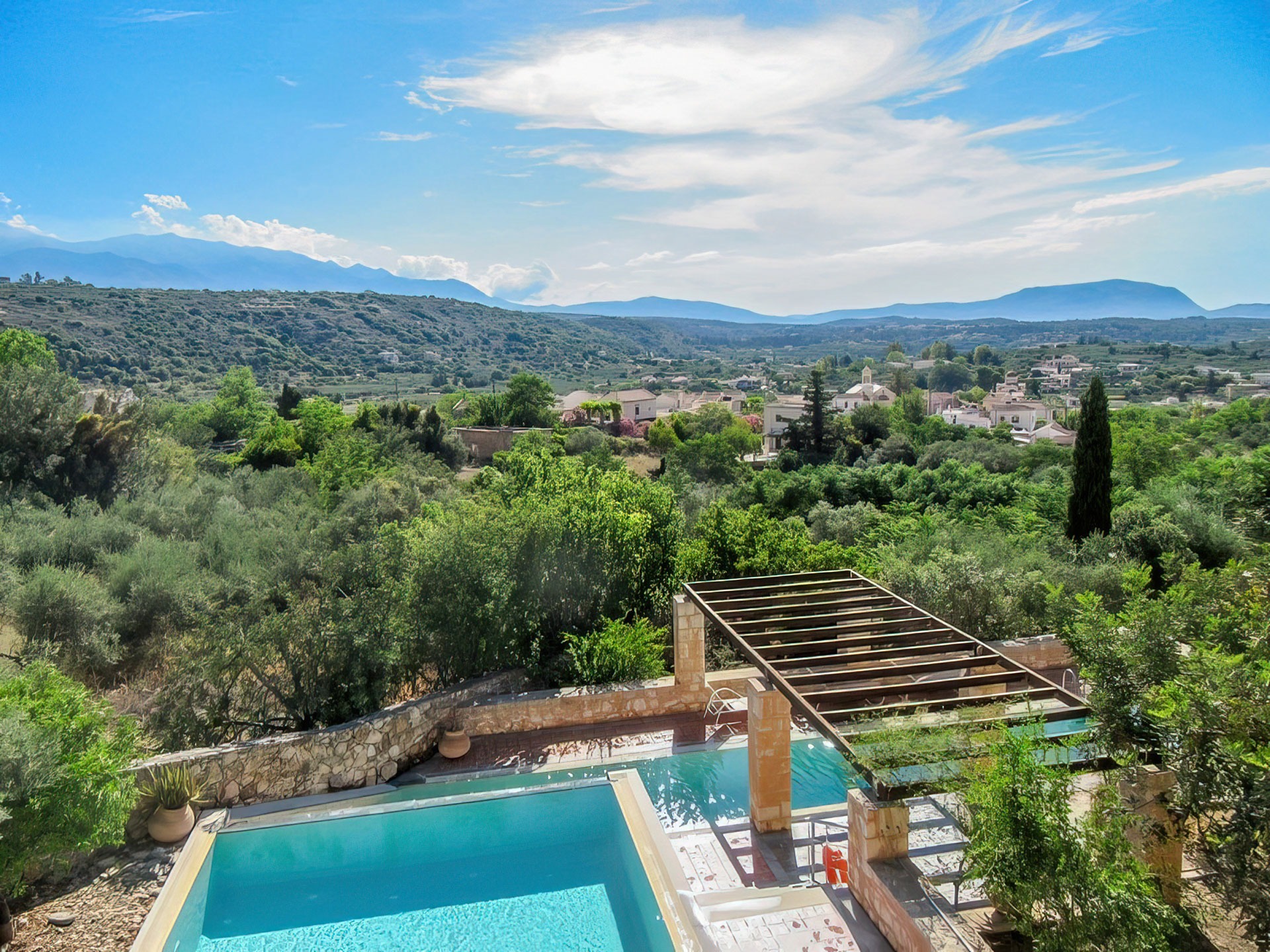 Villa Ariadne is a beautiful stone villa with 4 bedrooms and 3 1/2 bathrooms, located 3 kilometers away from Almyrida Beach. The villa is built on a hill in the traditional village of Gavalochori, approximately 25 kilometers east of Chania, Crete. It offers stunning views of the White Mountains and the valleys below. Its architecture is unique, with high vaulted ceilings and interior finishes made of exquisite wood. Additionally, it features two private pools - a regular-sized pool and a round one. The villa includes two master bedrooms and two twin bedrooms, accommodating up to 10 people with the addition of two single beds. The nearest beach, Almyrida, is just 3 kilometers away, while the closest shops can be found within a distance of 200 meters.