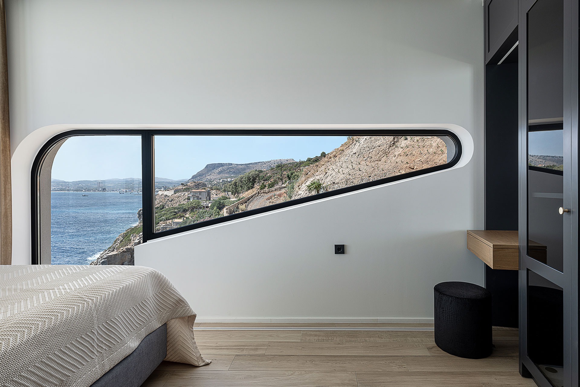 The ground floor boasts a kitchen and a large living room with a dining area, sofa, TV, and fireplace. Its massive sliding windows merge the living room with the pool area, creating an immense space for unforgettable parties. Guests can savor the picturesque views of Heraklion bay and the city lights at night, while early risers can relish the sunrise over the sea.